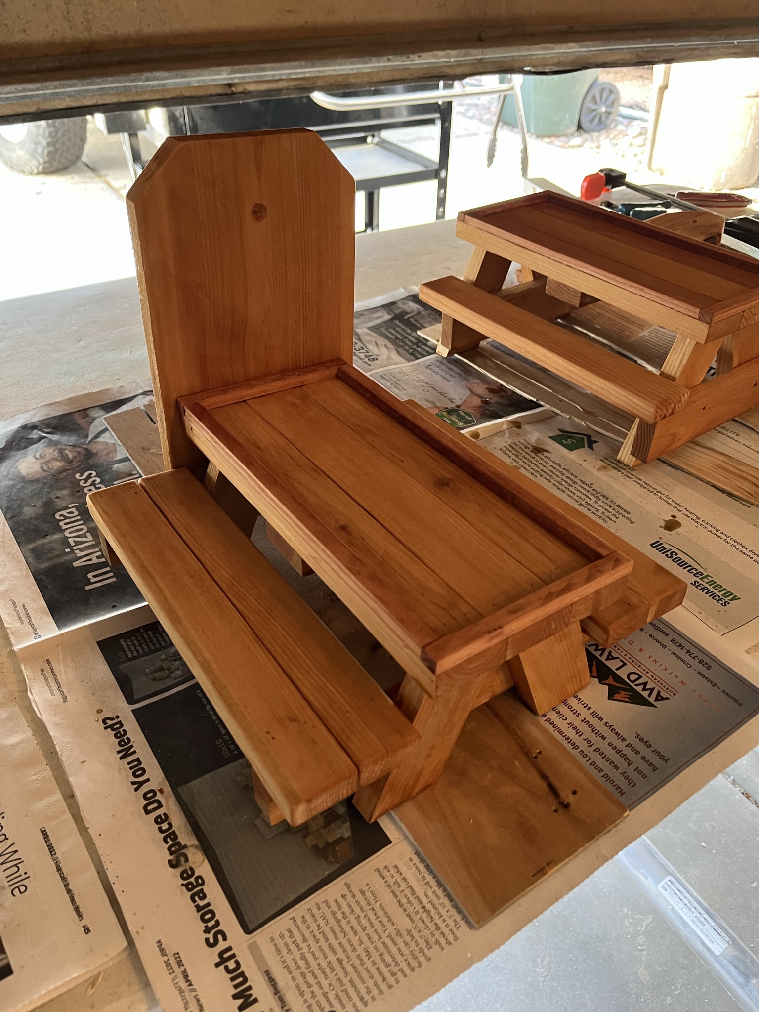 These cute squirrel tables are good for laying out a picnic for a variety of critters. With attached mounting board, they can be attached to a fence or tree, or free standing. Raised edge creates a feeding trough. $25