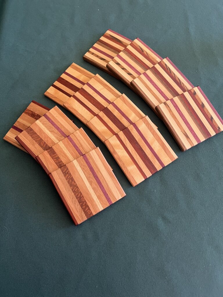 The coasters are nominally 3 5/8 x 3 5/8, $28 for a set of four. Hardwood coasters include Maple, Birch, Cherry and Walnut. Exotics may include African Padauk, Purple Heart, Leopardwood & Zebrawood.