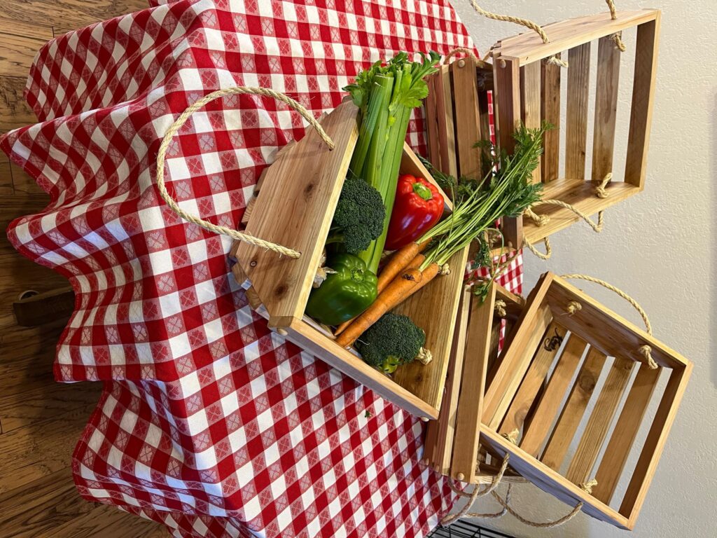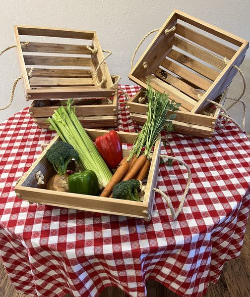 Baskets are 13” wide x 14” long x 6” tall. These rustic garden baskets are handmade out of cedar. Cedar is a naturally rot & insect resistant & light weight. The handles are made out of 3/8” sisal rope. At $35.00 each (tax included) these will not last long.